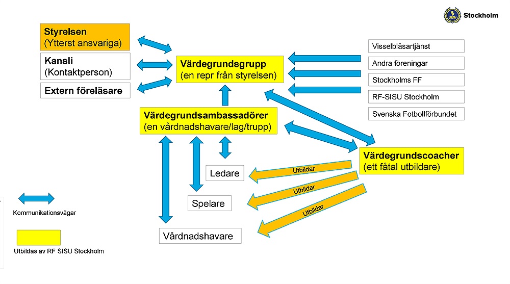 Föreningen har ett Värdegrundsråd (föreningens värdegrundsgrupp) som består av en från styrelsen, en med föräldraperspektiv och en från sporten. Gruppens sammankallande är en så kallad värdegrundsansvarig som. Tillsammans ska rådet ses en gång i månaden för att ta beslut i ärenden, arrangera utbildningar, kalla det till möten med föreningens värdegrunds-ledare (föreningens värdegrundsambassadörer) och kommunicera ut detta i föreningens kanaler. Värdegrundsrådet ska följa idrottens värdegrundsarbete och har föreningens styrelse och föreningens policys till sin hjälp för att ta beslut i frågor som berör enskilda medlemmar.